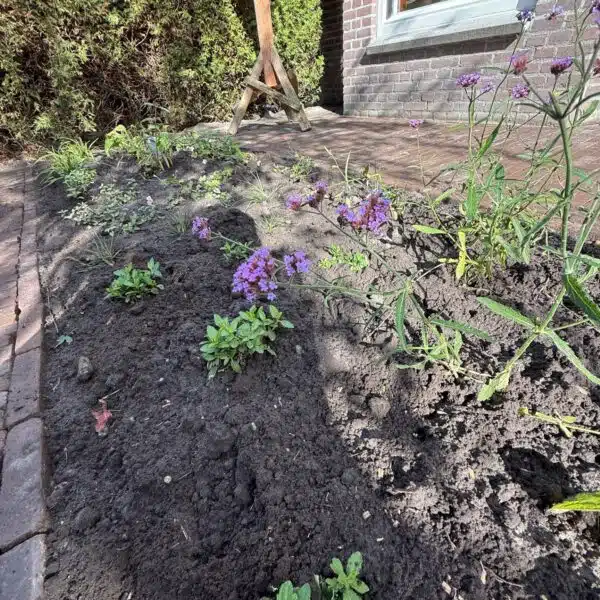 De combinatie van nostalgische materialen en kleurrijke beplanting geeft de tuin een warme, uitnodigende sfeer. De zorgvuldig gekozen planten zorgen voor afwisseling in kleur en bloei gedurende het hele seizoen, waardoor de voortuin in elk jaargetijde aantrekkelijk blijft.