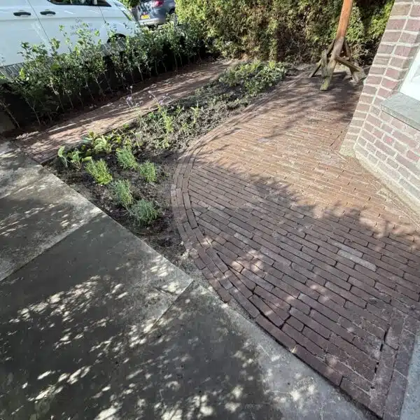 Bij een karakteristieke jaren ’30 woning in Leeuwarden is een stijlvolle voortuin aangelegd die perfect aansluit bij de authentieke uitstraling van het huis. In het ontwerp zijn oude gebakken klinkers hergebruikt, gelegd in een halfsteens verband met sierlijke rondingen die zorgen voor een natuurlijke en vloeiende lijn in het straatwerk.