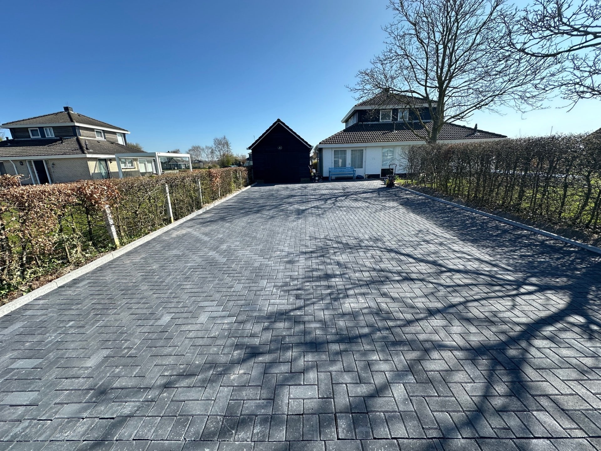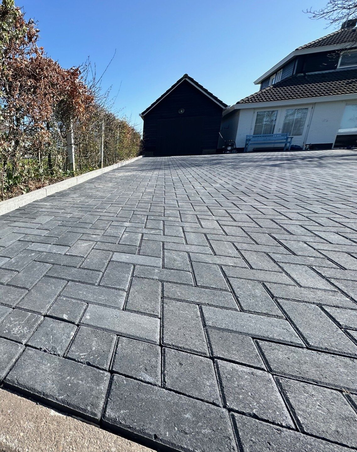 Onder de bestrating is een fundering van 30 cm gebroken puin aangebracht, wat zorgt voor een stabiele basis en optimale waterafvoer. Hierdoor blijft de oprit jarenlang vlak en bestand tegen intensief gebruik en alle weersomstandigheden. De antracietkleurige bestrating zorgt voor een tijdloos en stijlvol effect, terwijl de dikte van de klinkers garant staat voor een solide en onderhoudsarme ondergrond. Dankzij de zorgvuldige aanleg ligt de oprit perfect vlak en is hij bestand tegen intensief gebruik en wisselende weersomstandigheden.