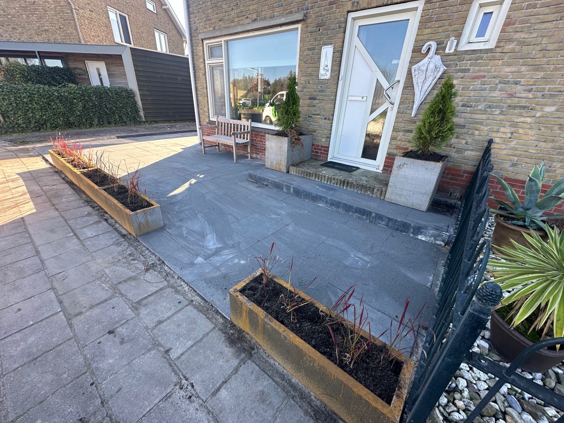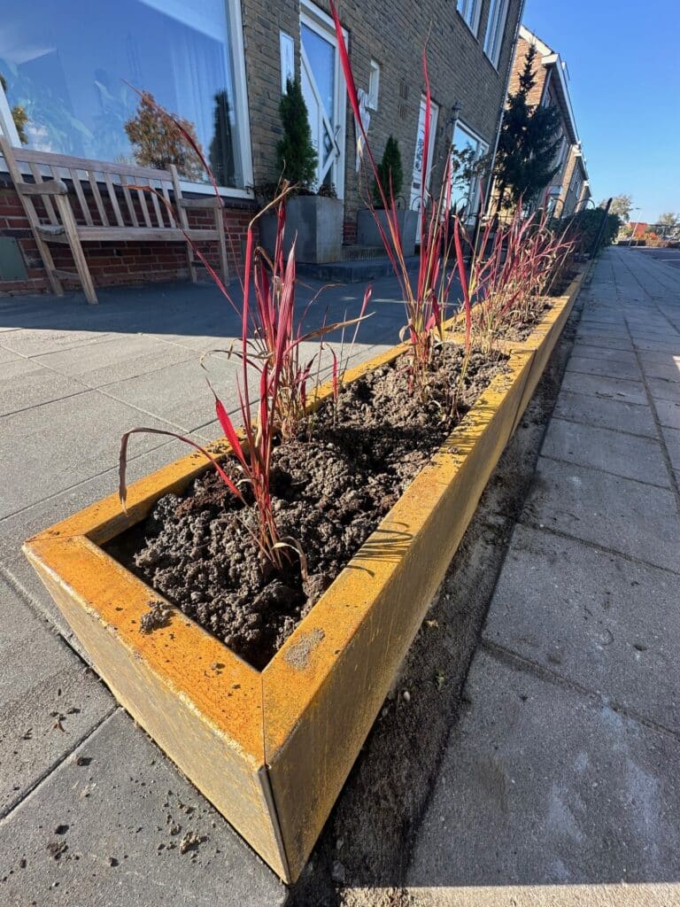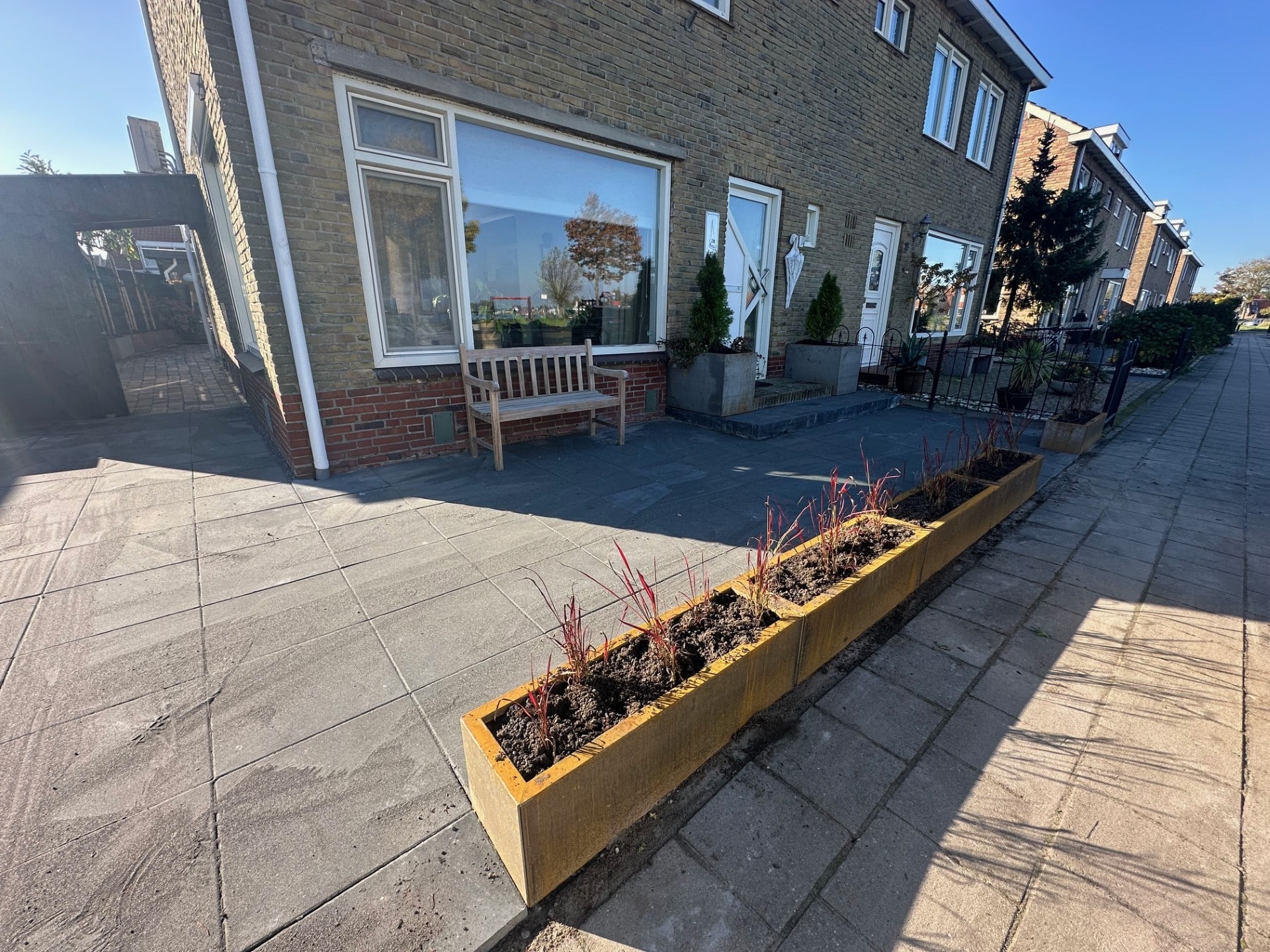 In Grou is een stijlvolle voortuin en achtertuin aangelegd waarin cortenstaal een prominente rol speelt. In de voortuin zorgen cortenstalen plantenbakken met Japans bloedgras (Imperata cylindrica ‘Red Baron’) voor een modern en kleurrijk accent. De warme roestbruine tint van het cortenstaal vormt een prachtig contrast met het dieprode siergras, wat zorgt voor een eigentijdse en levendige uitstraling.