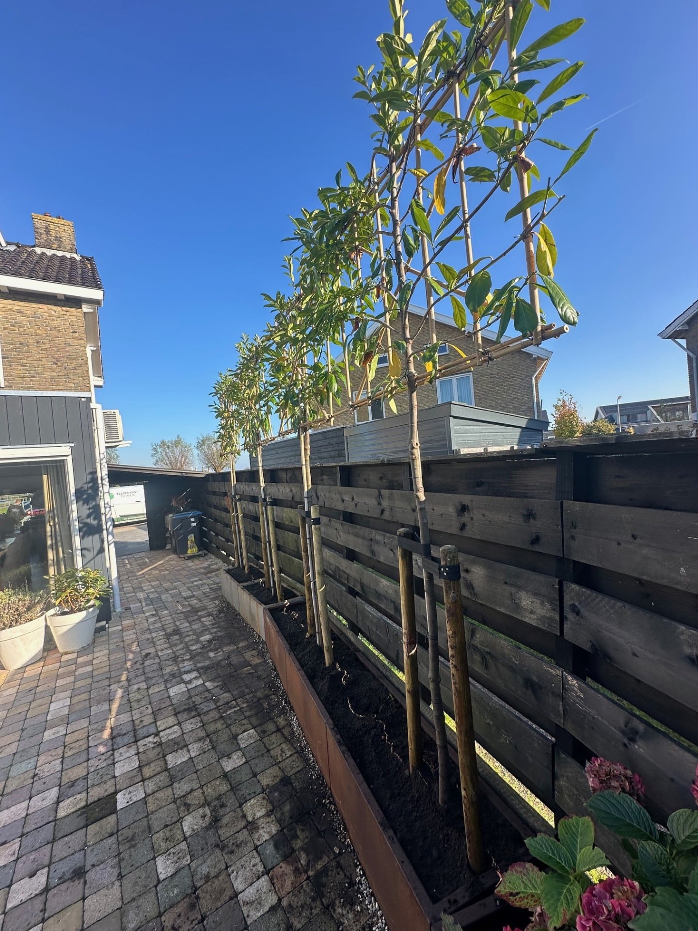 De achtertuin sluit hier naadloos op aan en is eveneens voorzien van cortenstaal elementen gecombineerd met Prunus leilindes. Deze leibomen creëren privacy en geven de tuin een groene, natuurlijke structuur. De bestrating met grote antracietkleurige tegels maakt het geheel strak, ruimtelijk en onderhoudsvriendelijk.